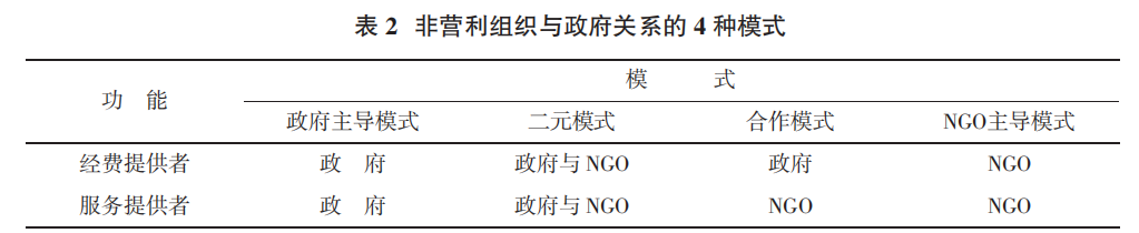 随着市场的自由化,非政府组织的数量和规模都在不断扩大,非政府组织与政府的关系也是中国公共组织间关系的研究重点。秦辉老师在《政府与企业之外的现代化》一文中提出,中国的非政府组织和政府组织存在着对抗关系,中国的非政府组织为建立公民社会而奋斗,它实际上要从争取最起码的公民参与空间做起。而美国大多数非政府组织从成立起就强调独立,甚至急于撇清自己与政府的关系,以成为监督政府的watch dog为傲。从下表中提供的信息来看,美国非政府组织(表中NGO可代指非营利组织)与政府的关系是互不干涉、独立并存的二元模式,在某些领域还存在着NGO主导的模式。在游学中我们了解到,尽管美国很多非政府组织会向政府申请税收优惠或资金支持,但一般不会超过运营经费总额的15%,因此合作模式并不常见。反观中国,政府主导模式始终贯穿每一个层级,近年来则逐渐向合作模式靠拢,NGO独立主导的现象则非常稀少。