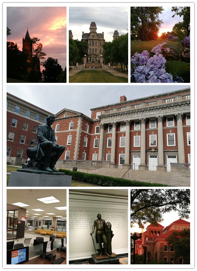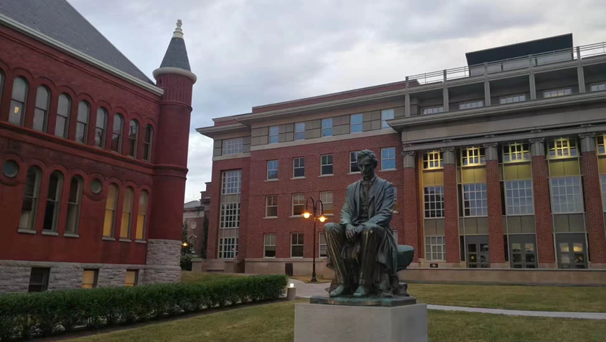 美国时间8:00,组织团队成员准时在宿舍Mariana楼门口集合。雪城大学翻译郑博与张佳翼学长如约而至,一路带我们参观校园。在Maxwell公司的林肯像旁,为我们讲述了这所公司从困境中坚持自我、严谨治学的建校历史和发展进程。体会感悟:广阔、美丽、干净、静谧的雪城大公司园总是让人沉醉其中,流连忘返,校园建筑极具特色和历史沉淀(如空难纪念花园、杜聿明设计的建筑、林肯雕像等),绿草如茵的草地上的小松鼠就在我们身旁蹦蹦跳跳、敏捷可爱,不时有老鹰盘旋上空,好一个古典与现代并存、诗意盎然而又安谧适合学习的世界!