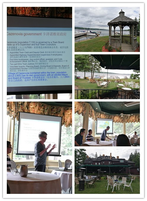 上完课,我们马上前往卡泽诺维亚小镇,来到奥侬达嘎湖边的一个餐馆,湖水与蓝天白云交相辉映,帆船在粼粼的波光中时隐时现。马克斯韦尔公司公民权与民主普查家族讲席教授、政治学系荣休教授安德森博士为我们上了一堂生动有趣的课程《公开而高效的地方政府》。安德森博士结合自己的实践经验,讲述了地方政府如何开放高效地运转,并就奥侬达嘎湖污水治理、葡萄园噪声治理的具体案例,分析了州政府与镇政府的相互关系。体会感悟:安德森博士是雪城大学马克斯维尔公司的最受欢迎的前系主任之一,又担任过镇政府的官员,治理理论与实践经验相结合,很有学术研究理论水平,又有基层政府实践经验,让人强烈感受到原汁原味的美国本土治理理论与实践相结合的典型范例。我提问安德森教授:她授课内容中的dog control officer是做什么的?她告诉我们:这是镇政府里专门管理镇里每一条狗的出生、卫生防疫、甚至处理狗狗打架纠纷等的镇政府工作人员,我不由得感叹美国地方政府很强的自治能力、治理的严谨与周密细致;我还请教的问题是:您如何看待地方政府的discretion(自由裁量权)?教授也都耐心给了回答……窗外,是奥侬达嘎湖,碧水蓝天,帆船点点,让我们见识了这个湖的美丽,我们根本没想到这个湖以前的污染程度是何等触目惊心,这个湖也为后一天的环境污染学习课程埋下了伏笔(佩服课程设计者的独具匠心)。