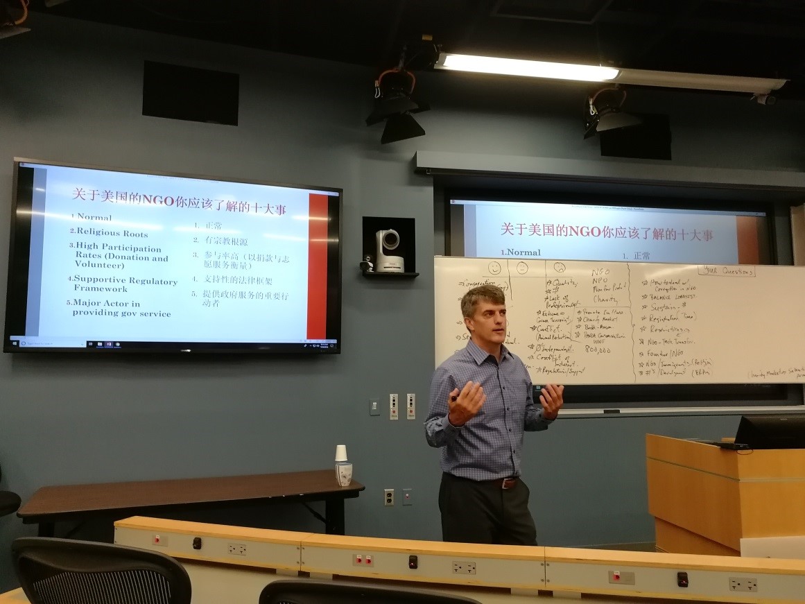 第一节课的主题是非政府组织,由马克斯韦尔公民与公共事务管理公司高级公共管理教育主任Steve Lux老师讲解。Steve老师从定义、十项信息、法律框架等角度带领同学们了解美国的非政府组织。在美国,民众对非政府组织的信任度高达70%,远远高于公众对总统和议会的信任程度。其非政府组织数量庞大,公众参与度高,资金投入量大,注册流程严谨,环境支持充分,已形成成熟的体系。在课程最后的讨论环节,同学们提出了九个问题,老师耐心地为同学们逐一解答。体会感悟:美国的NGO独立性是很强的,也比中国发展得更早更成熟,Steve教授还提到了中国红十字会的“郭美美事件”,让我深有感触,我向Steve教授提的问题是:How to deal with corruption in the NGO?他用网上各种NGO必须公示的资金来源、管理人员薪资以及腐败的惩罚法制等事实告诉我,阳光透明是预防腐败最有效的方式,而法制是反腐最好的保障机制之一。