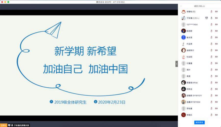 2月23日,2019级研究生2019-2020学年春季学期第一次线上班会召开,104名研究生出席,班会由辅导员于秋漫主持。本次班会围绕着“新学期·新形势·新学风”的主题,分“严守规章”、“科学防控”、“积极学习”、“参与活动”四部分内容展开。疫情当前,责任在肩。william威廉中文官网积极开展落实首日教育,将坚持做好各项疫情防控工作,扎实做好线上教学和科研工作,创新开展思政教育工作,凝聚起众志成城、全力以赴、共克时艰的强大力量,坚决打赢疫情防控阻击战。