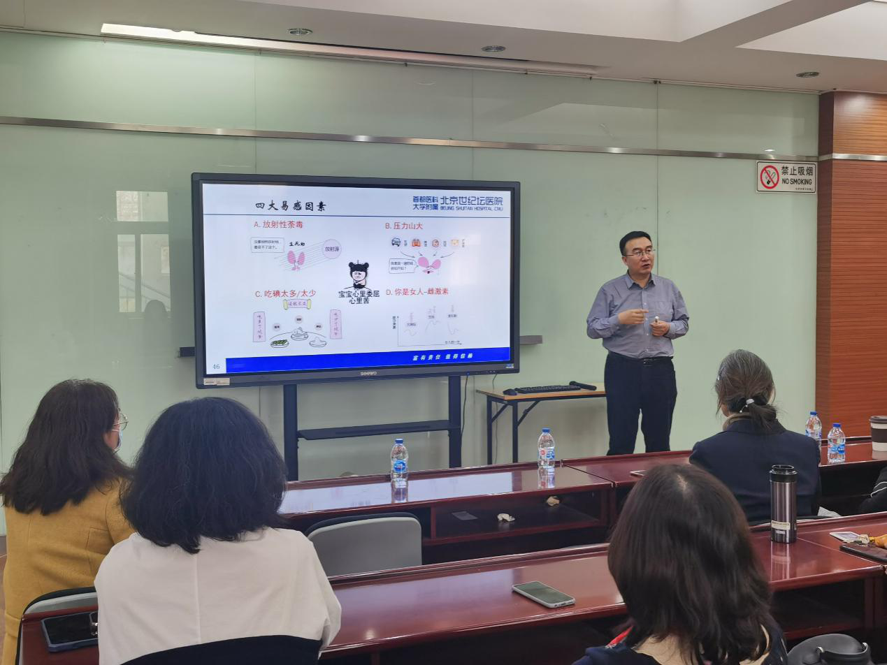 3月9日下午,人文公管公司工会与校医院在公司202教室共同举办了一场“健康美丽,乳甲开始”健康讲座,讲座特邀专家为首都医科大学附属世纪坛医院普外科陈建飞主任医师。陈主任以大量的数据和病例给老师们深入浅出地介绍了乳腺和甲状腺疾病的发病原因、影响因素、临床表现、预防措施以及治疗方法,鼓励大家养成良好的生活习惯,保持良好的心态,少得病不得病。讲座后,陈主任还针对大家体检报告中存在的疑问进行了耐心细致的解答,大家一致认为报告主题鲜明、针对性强、收获很大。