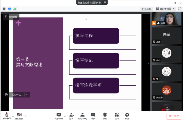 最后马琪老师落脚于文献综述的撰写,详细介绍了大纲设计、文献引用等方面的撰写规范,重点强调了切忌述而不评等注意事项,为同学们在文献综述等方面的写作带来了极大的帮助。