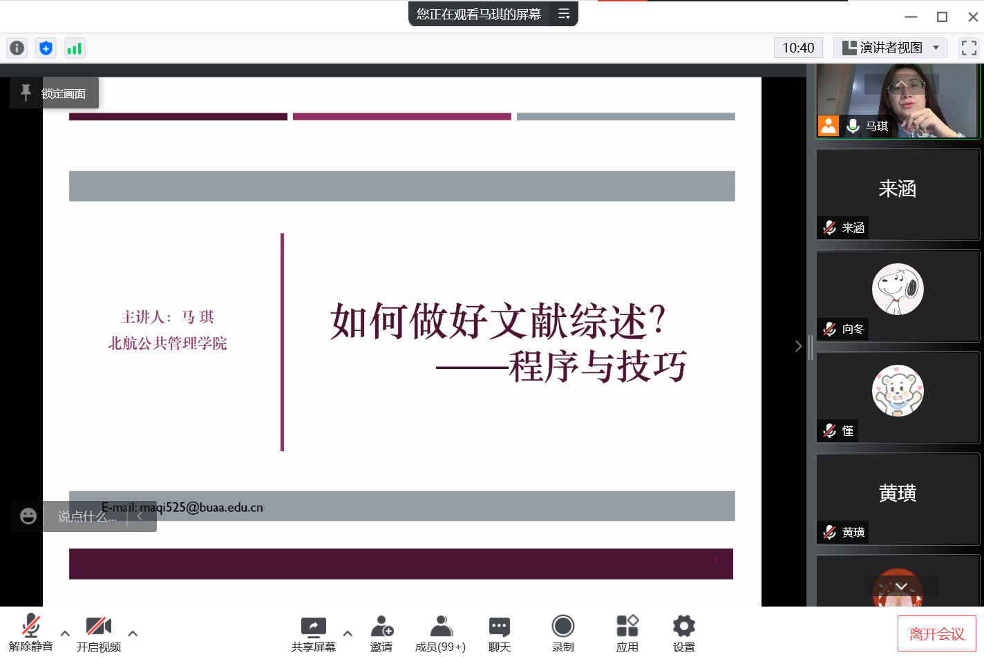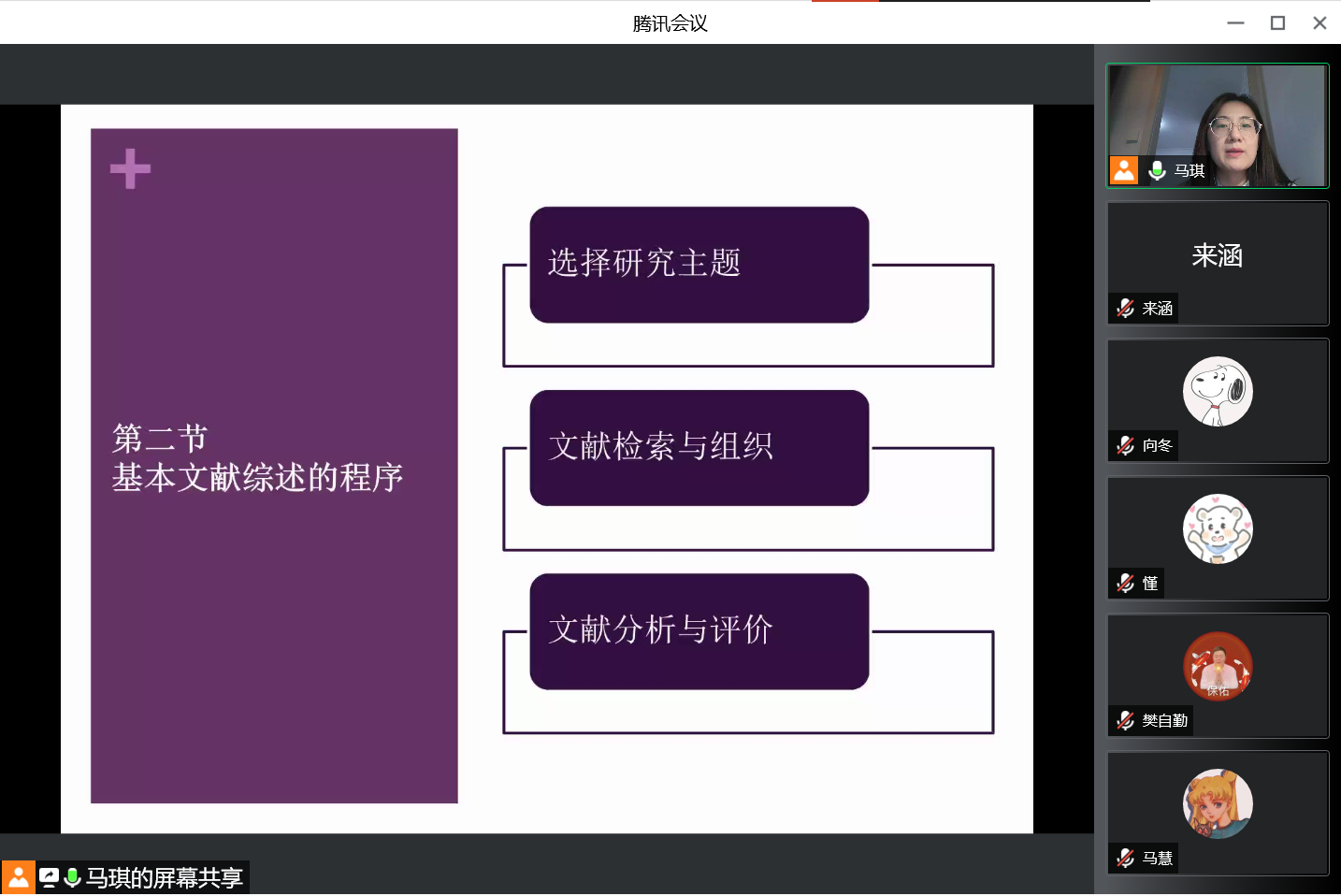 而后马琪老师围绕选择研究主题、文献检索与组织以及文献分析与评价,重点介绍了基本文献综述的程序。