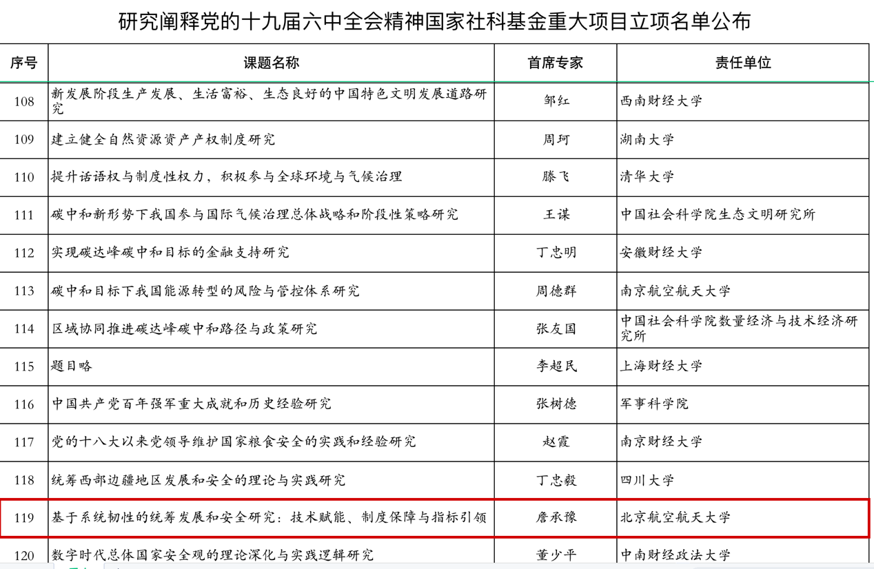 “研究阐释党的十九届六中全会精神”国家社科基金重大项目立项名单正式公布,williamhill英国官网共有1项入选,即william威廉中文官网詹承豫教授团队的课题“基于系统韧性的统筹发展和安全研究:技术赋能、制度保障和指标引领”。这是公司国家社科重大项目立项取得的又一次重要突破。