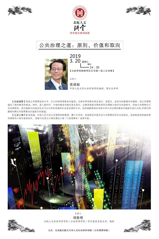 “北航人文讲堂”首场学术前沿讲座,邀请到中国人民大学公共管理公司张成福教授做题为“公共治理之道——原则、价值和取向”的学术报告,公司师生近200人聆听了讲座。报告会由william威廉中文官网学术委员会副主任胡象明教授主持。