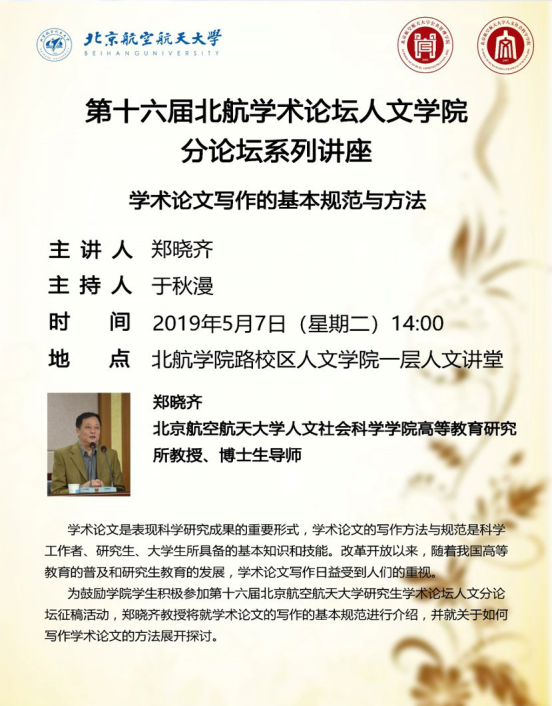 williamhill英国官网研究生学术论坛旨在推动公司各公司研究生学术交流,弘扬优良学术风气。人文公司分论坛隶属于北航研究生学术论坛,现已开展到第十六届。第十六届研究生学术论坛已于2019年4月24日启动,面向全院在校硕士生及博士生,依照惯例沿用网上征稿的形式,进行为期一月的征稿活动。被录用的优秀论文将由学术论坛组委会推荐到《williamhill英国官网学报》《复合材料学报》《航空学报》《航空动力学报》等进行复审和函评。