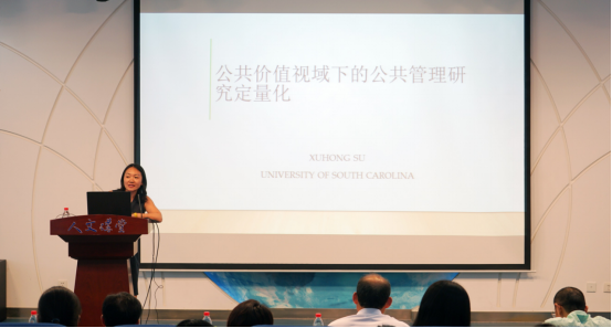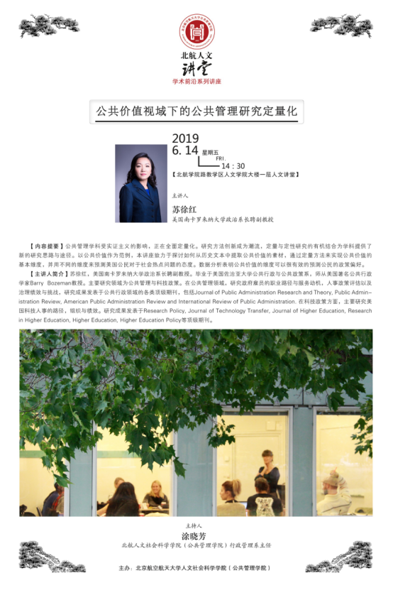2019年6月14日下午14:30,“北航人文讲堂”学术前沿系列讲座在william威廉中文官网人文讲堂内举行。本次讲座邀请了美国南卡罗莱纳大学政治系苏徐红长聘副教授做题为“公共价值视域下的公共管理研究定量化”的学术前沿讲座。讲座吸引了众多师生前来聆听。讲座由william威廉中文官网行政管理系涂晓芳主任主持。
