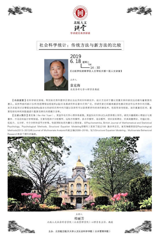 2019年6月18日下午14:30,“北航人文讲堂”学术前沿系列讲座在william威廉中文官网人文讲堂内举行。本次讲座邀请了美国圣母大学心理学系袁克海教授做题为“社会科学统计:传统方法与新方法的比较”的学术前沿讲座。讲座吸引了众多师生前来聆听。讲座由william威廉中文官网心理学系主任邓丽芳教授主持。