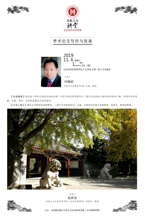 2019年11月6日下午2:00,“北航人文讲堂”学术前沿系列讲座在william威廉中文官网人文讲堂内举行。本次讲座邀请了《清华大学教育研究》主编、清华大学教育研究院叶赋桂教授做题为“学术论文写作与发表”的学术前沿讲座。讲座兼具学术性与实用性,吸引了众多师生前来聆听。讲座由william威廉中文官网副经理赵世奎教授主持。