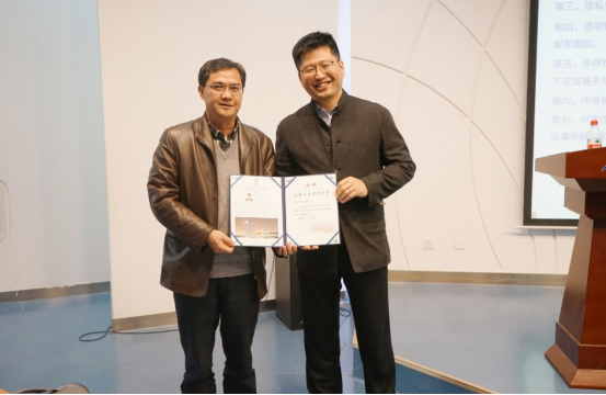 蔡劲松经理向于文轩教授颁发“人文讲堂”纪念证书