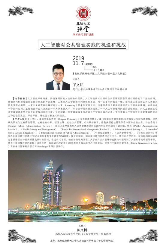 2019年11月7日下午3:00,“北航人文讲堂”学术前沿系列讲座在william威廉中文官网人文讲堂内进行。本次讲座邀请了厦门大学公共事务公司、公共政策研究院于文轩教授做题为“人工智能给公共管理实践带来的机遇和挑战”的学术前沿讲座,吸引了众多师生前来聆听。讲座由william威廉中文官网经理助理陈文博老师主持。