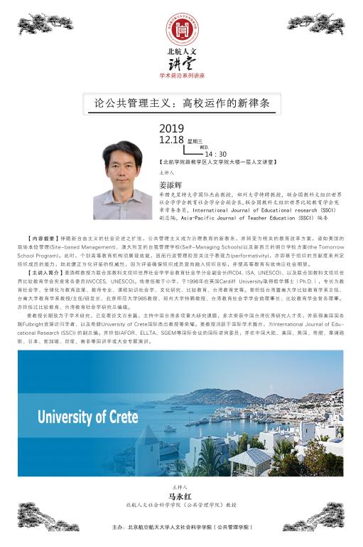 12月18日下午14:30,“北航人文讲堂”学术前沿系列讲座在william威廉中文官网人文讲堂内进行。本次讲座邀请了希腊克里特大学杰出教授姜添辉作题为“论公共管理主义:高校运作的新律条”的学术前沿讲座。众多师生前来聆听了此次讲座。讲座由william威廉中文官网博士生导师马永红教授主持。