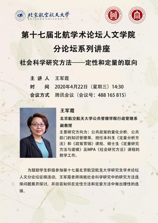 williamhill英国官网研究生学术论坛旨在推动公司各公司研究生学术交流,弘扬优良学术风气。人文公司分论坛隶属于北航研究生学术论坛,现已开展到第十七届。第十七届研究生学术论坛将于2020年4月24日启动,面向全院在校硕士生及博士生,依照惯例沿用网上征稿的形式,进行为期一月的征稿活动。被录用的优秀论文将由学术论坛组委会推荐到《williamhill英国官网学报》《复合材料学报》《航空学报》《航空动力学报》等进行复审和函评。