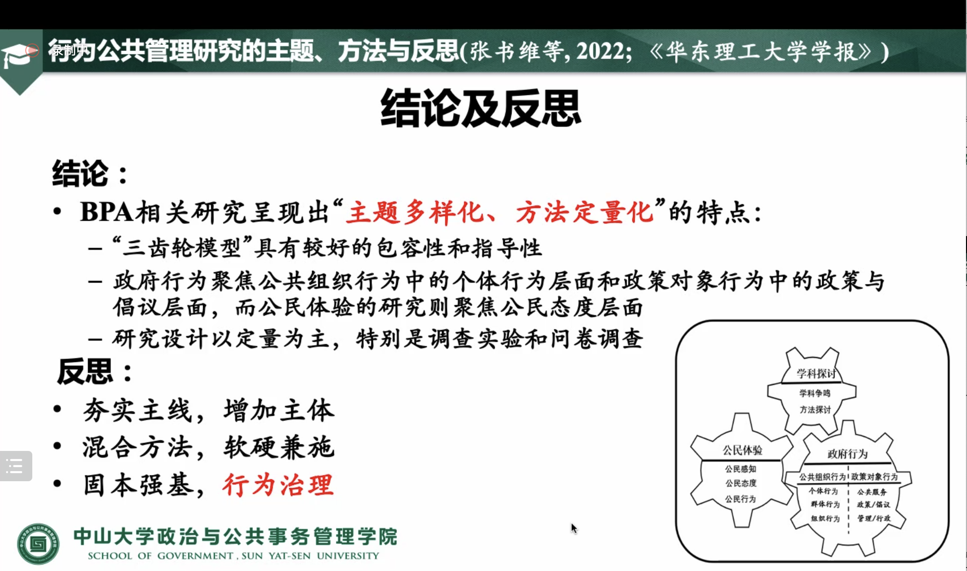 张书维教授首先介绍了行为公共管理学(BPA)理论背景与概念界定,以及相关研究主题和方法,总结认为相关研究呈现“主题多样化、方法定量化”的特点,并指明未来研究应夯实主线,增加主体研究,多采用混合研究方法,达到为行为公共治理“固本强基”的目的。