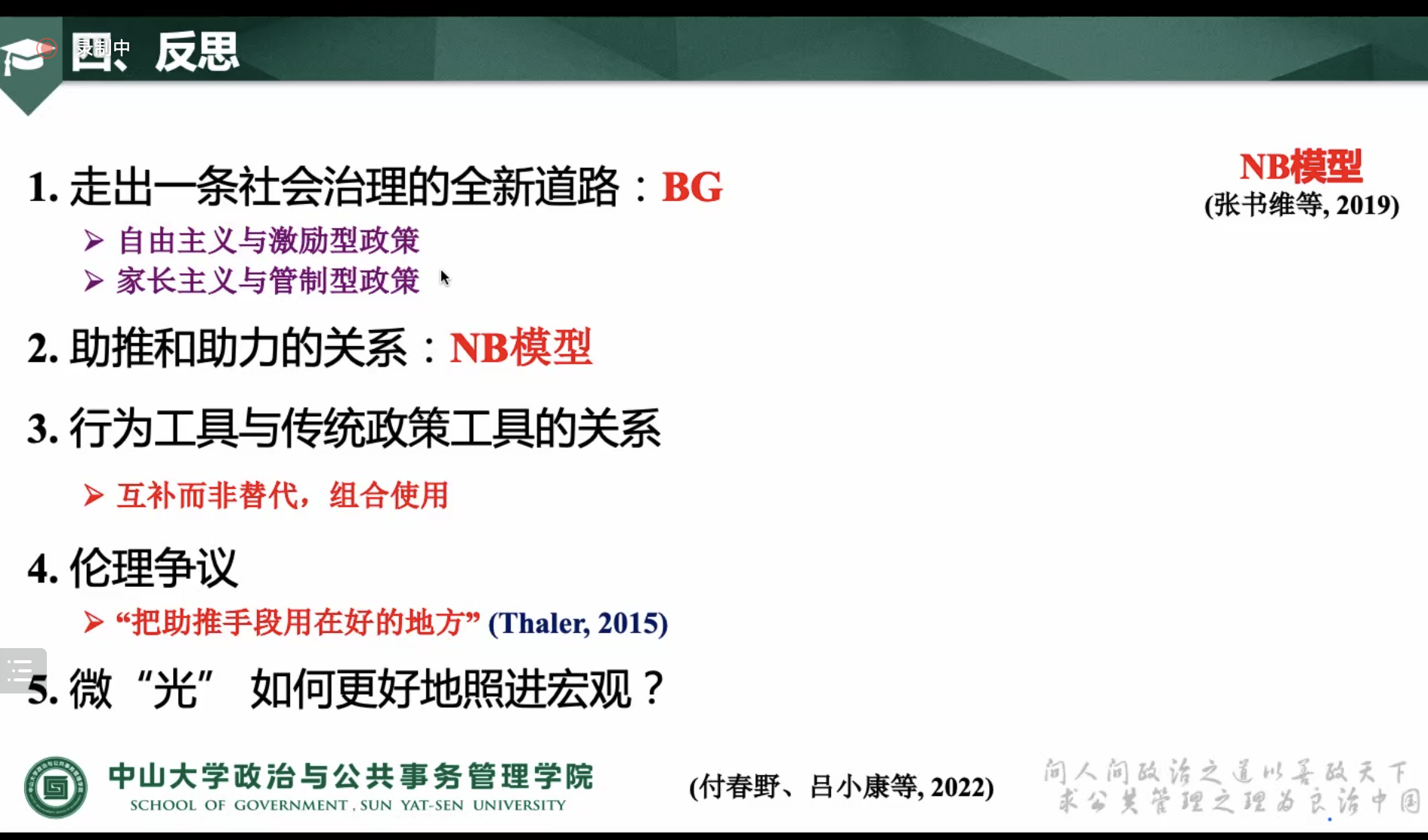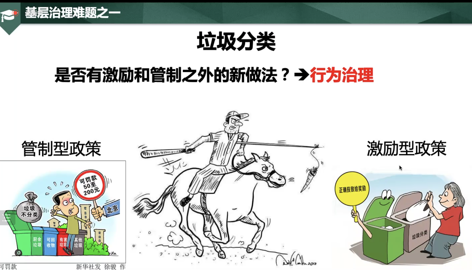 本次讲座中,张书维教授从“垃圾分类”引入,指出管制型政策和激励型政策在基层治理中面临执行成本高、公民难接受的主要困境,并介绍 “行为治理(BG)”这一提升国家基层治理能力的新路径。