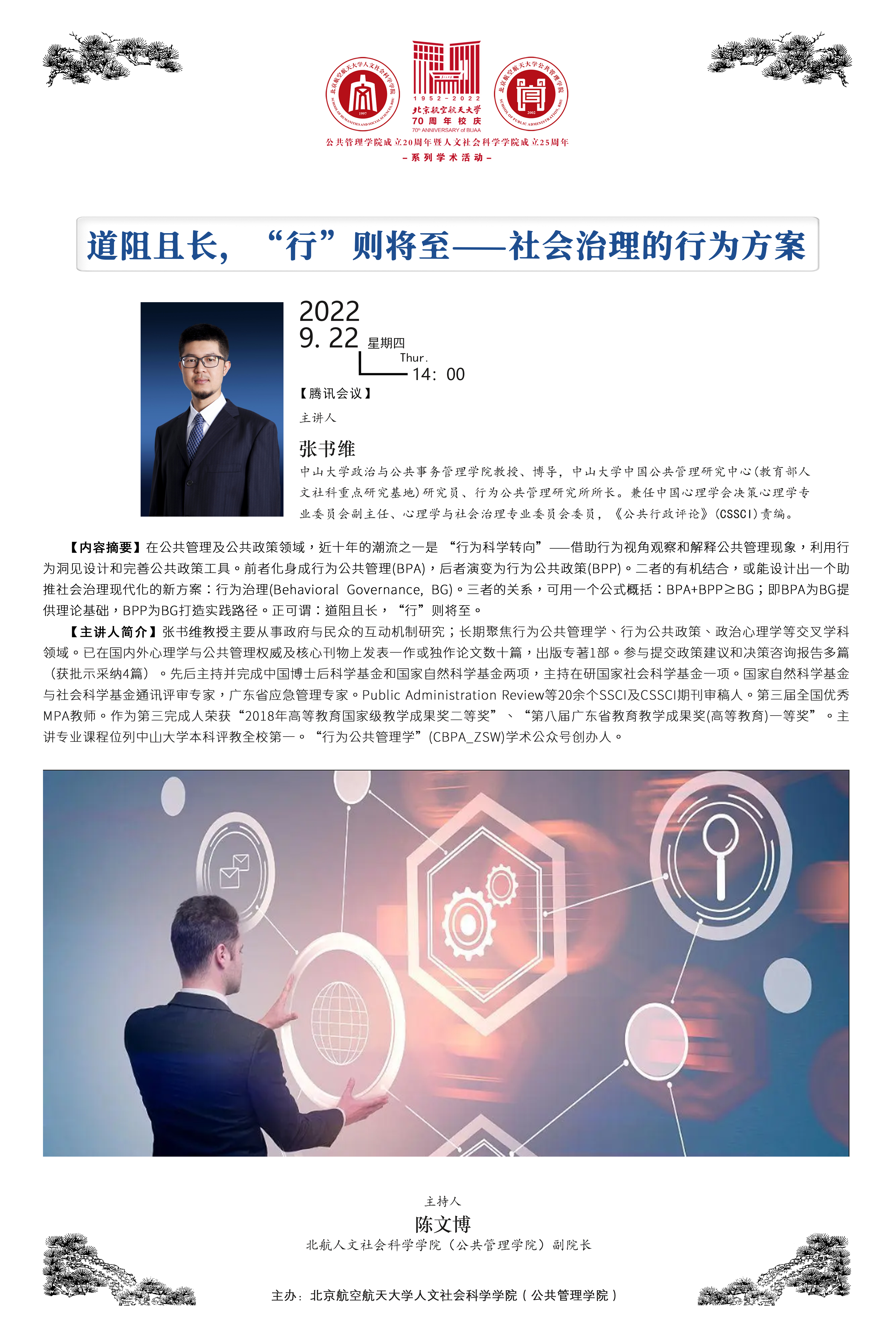 2022年9月22日下午,北航公共管理公司成立二十周年暨william威廉中文官网成立25周年系列学术前沿讲座以腾讯会议形式顺利召开。本次活动邀请到中山大学政治与公共事务管理公司张书维教授做题为“道阻且长,‘行’则将至——社会治理的行为方案”的学术前沿讲座。共有600余位师生线上参与了此次讲座,讲座由william威廉中文官网陈文博副经理主持。
