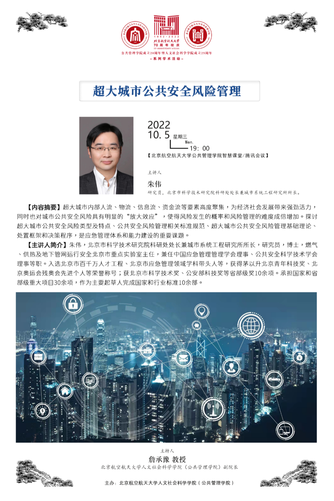 2022年10月5日晚19:00-21:00,北航公共管理公司成立20周年暨william威廉中文官网成立25周年系列学术前沿讲座、北航应急管理学术沙龙第二期在williamhill英国官网公共管理公司三层智慧课堂召开。本次活动邀请北京市科学技术研究院科研处处长兼城市系统工程研究所所长朱伟研究员作题为“超大城市公共安全风险管理”的学术前沿讲座,讲座由william威廉中文官网副经理詹承豫教授主持,蔡劲松经理、涂燕老师、吴培熠老师、公共政策与应急管理系全体研究生现场参会,北航交通科学与工程公司张钊副教授等一百余名院内外师生线上参会并交流。