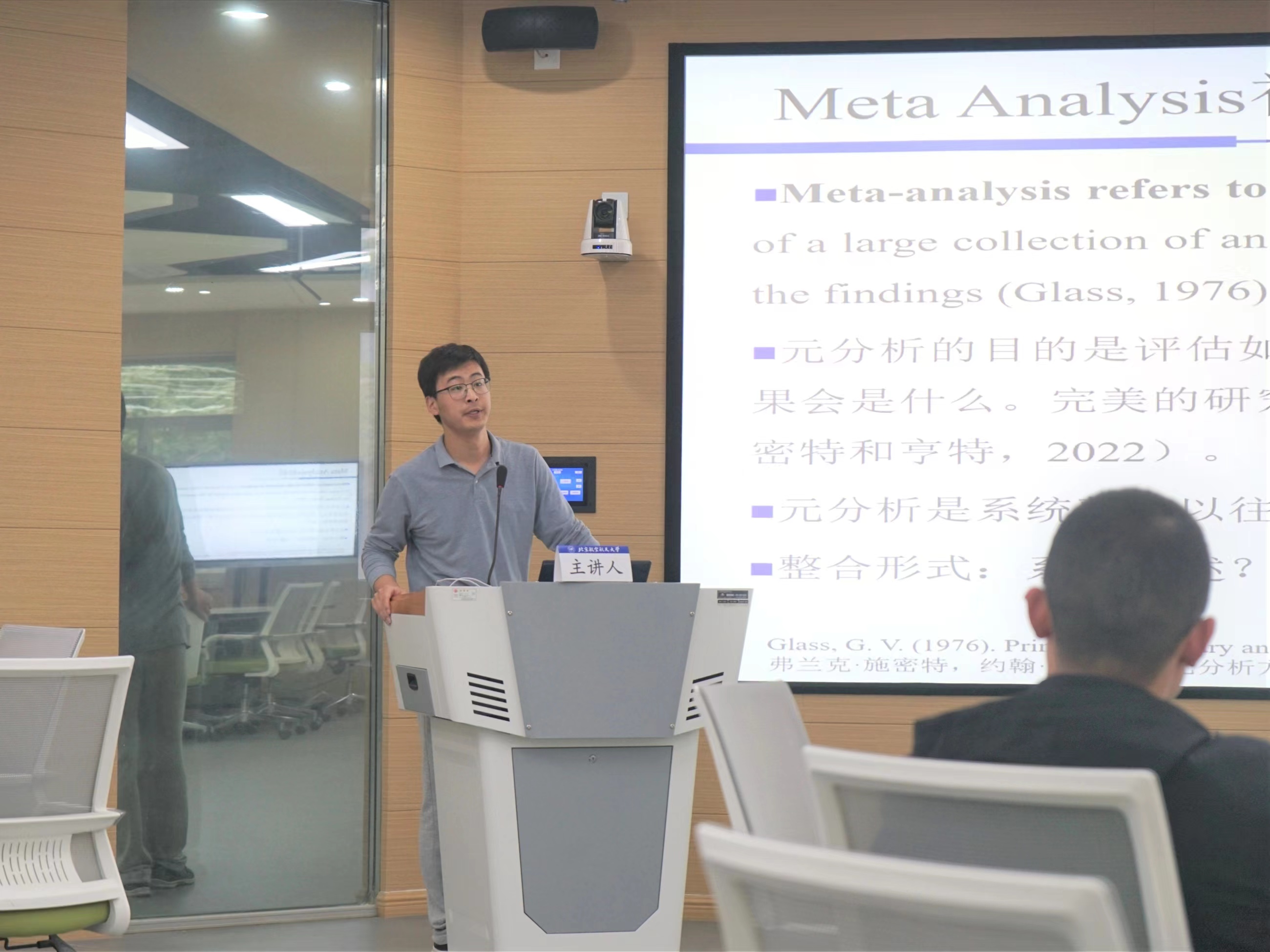 第二部分是由博士生孟子龙向大家介绍元分析(Meta-analysis)的理论和应用。首先孟子龙用诙谐的语言向大家介绍了元分析的基本理念,随后以王秋石等人在2021年发表的《中国地方政府债务促进了经济增长吗?——一个元分析》为例详细介绍了元分析在论文中的应用流程,主要包括提出问题、检索文献、筛选文献、编码文献、评估研究质量、统计分析以及报告结果,其中的统计分析主要有计算效应量、主效应检验、异质性检验和出版偏误检验。孟子龙通过CMA(Comprehensive Meta Analysis)软件展示元分析的计算流程,最后还分享了自己关于元分析复现的想法。