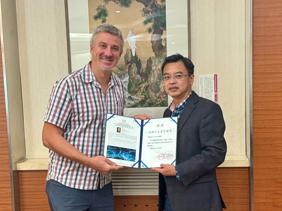 讲座结束后,公司高等教育研究所所长赵世奎教授向Scott Daniel博士颁发了"人文讲堂"证书。除了公司研究生外,本次活动得到了校内外多位专家学者参与,包括T.I.M.E.联盟秘书长Gwenaëlle Guillerme女士、辛辛那提大学博士后魏思卿博士,北京理工大学郑丽娜助理教授、北京外国语大学李明副教授,以及公司未来空天技术公司韩钰副经理、公司樊文强副教授、张惠副教授、杜佳卉博士后等。与会专家围绕社会技术思维培养展开深入研讨,充分体现了人文社会科学与工程教育的深度融合,为推动跨学科教学创新提供了重要启发。