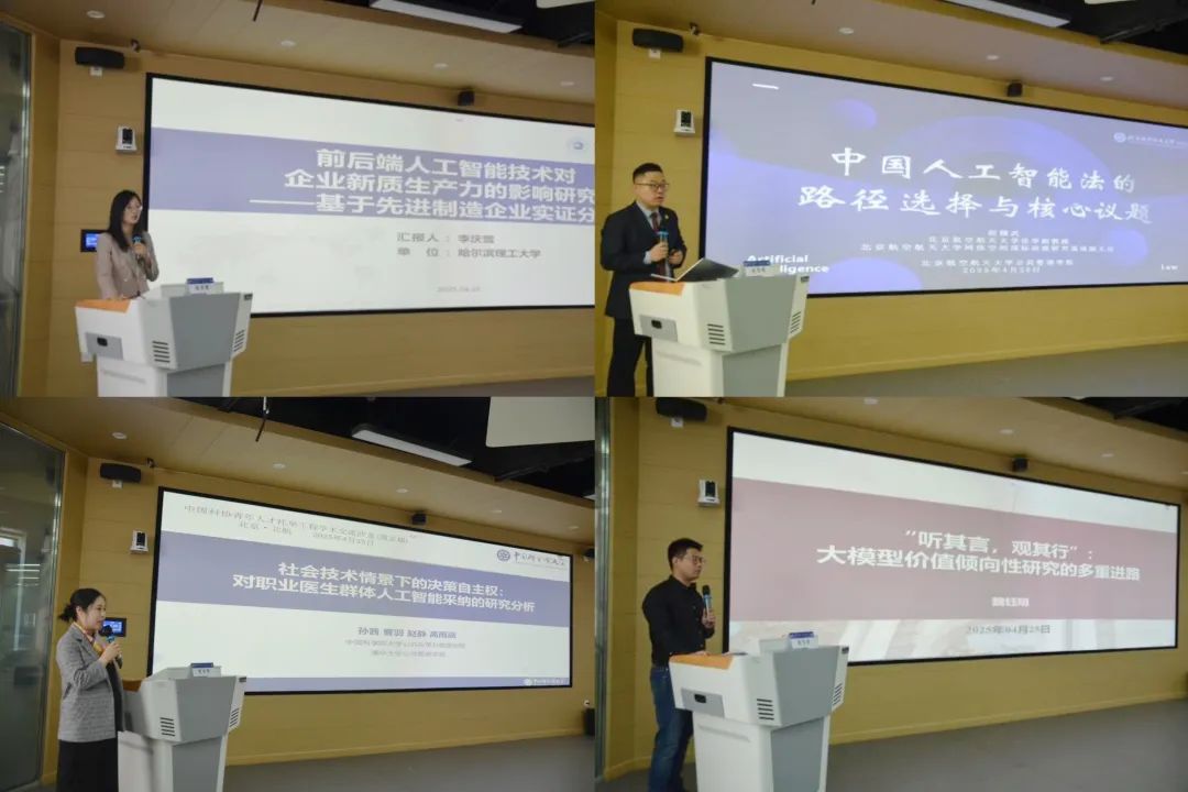 随后,八位青年学者依次发表专题报告。在上半场,哈尔滨理工大学李庆雪副教授通过实证分析揭示人工智能技术对企业生产力的多维影响,指出动态能力与人力资本在技术转化中的关键作用;williamhill英国官网赵精武副教授从法学视角剖析AI治理的路径争议,提出需平衡创新激励与风险管控;中国科公司大学孙茜副教授基于医疗场景研究,强调人机交互对医生决策自主权的赋能价值;清华大学魏钰明助理研究员则通过多重方法论,解析大模型价值倾向性研究的科学路径。