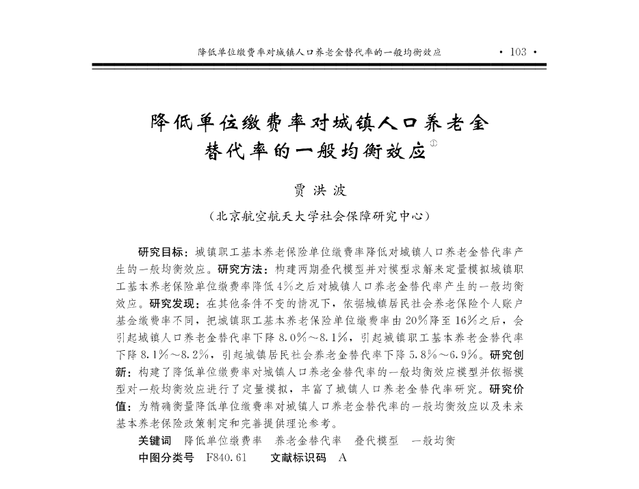 论文为精确衡量降低单位缴费率对城镇人口养老金替代率的一般均衡效应以及未来基本养老保险政策制定和完善提供理论参考。