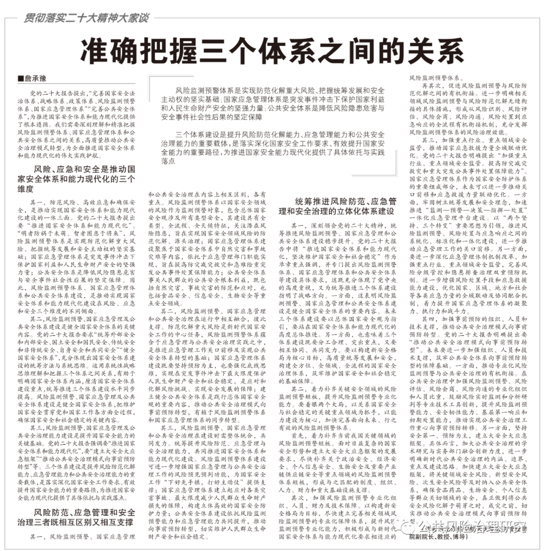 近日,williamhill英国官网公共管理公司副经理詹承豫教授接受《中国应急管理报》邀请,就贯彻落实党的二十大报告,理解和把握风险监测预警体系、国家应急管理体系和公共安全治理体系之间的逻辑关系做出阐释,发表《准确把握三个体系之间的关系》,以下为文章全文。