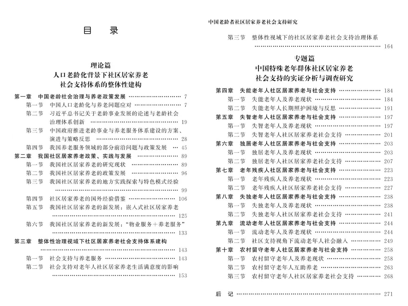 中国有着几千年的敬老孝老的传统美德,在机构养老等社会化服务尚不充分、家庭养老不断面临着来自人力资源缺乏等现实挑战的同时,如何依托社区建设与服务体系的完善夯实养老功能、创新养老机制,成为积极应对养老问题的重要途径。党的十八届五中全会提出“建设以居家为基础、社区为依托、机构为补充的多层次养老服务体系”,2016年政府工作报告提出“开展养老服务业综合改革试点”。“十三五”期间,民政部、财政部在全国遴选了五批、203个地区开展社区居家养老试点工作。改革试点实现规模效应、彰显示范价值。《“十四五”国家老龄事业发展和养老服务体系规划》明确,我国将加快健全居家社区机构相协调、医养康养相结合的养老服务体系,要求养老服务供给实现覆盖城乡、惠及全民、均衡合理、优质高效,促进多层次多样化养老服务优质规范发展。近年来,我国各地方不断创新养老方式,在完善社区软件、硬件基础设施、丰富服务供给内容、优化养老环境等方面持续发力,老有所养、老有所医、老有所教、老有所学、老有所为、老有所乐的愿景逐渐成为现实。面向未来,居家社区养老服务体系的健全与创新发展不仅是理论界需要持续研究的重点课题,也需要在实践中不断创新,探索可持续的发展路径,为广大老年群体提供优质规范、便利可及的养老服务。