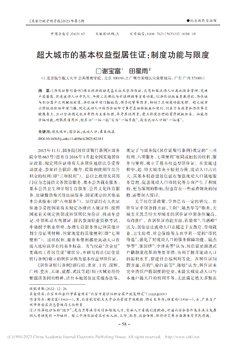关键词:超大城市;居住证;流动人口;基本权益