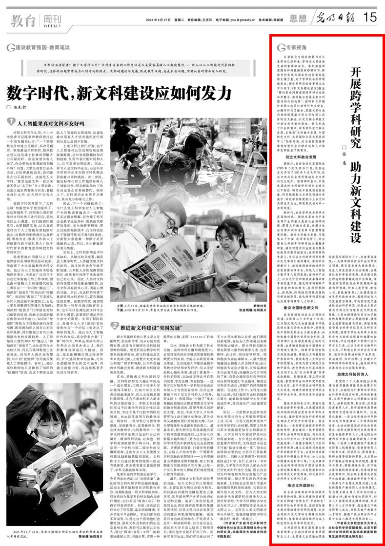 在全球治理体系和国际秩序大变革的时代,新文科建设的重要任务是构建“世界水平、中国特色”的哲学社会科学体系,追踪国际重大前沿领域跨学科研究趋势,走在全球新兴交叉学科与颠覆性创新的前列,探索兼具国际视野与本土特色的社会科学研究范式。