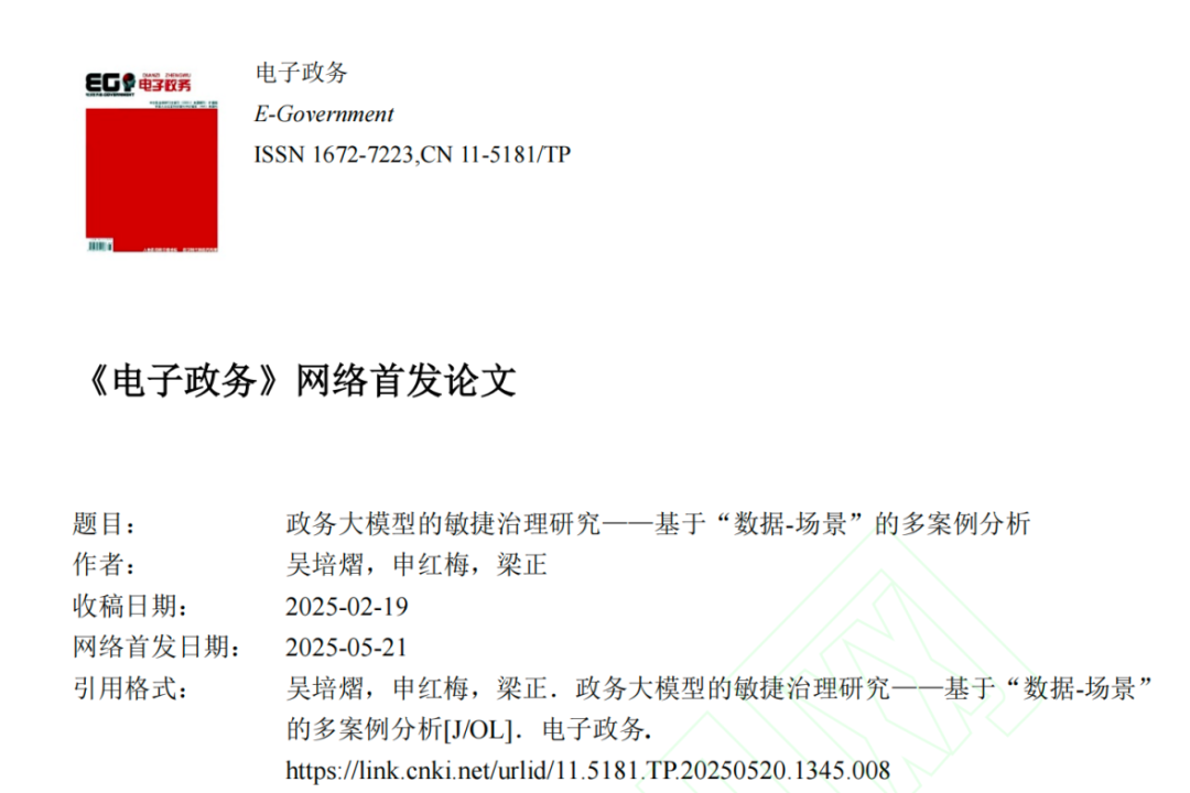 近日,william威廉中文官网吴培熠助理教授在《电子政务》(CSSCI)发表最新研究成果《政务大模型的敏捷治理研究——基于“数据-场景”的多案例分析》。文章合作者为清华大学公共管理公司梁正教授、公司博士生申红梅。