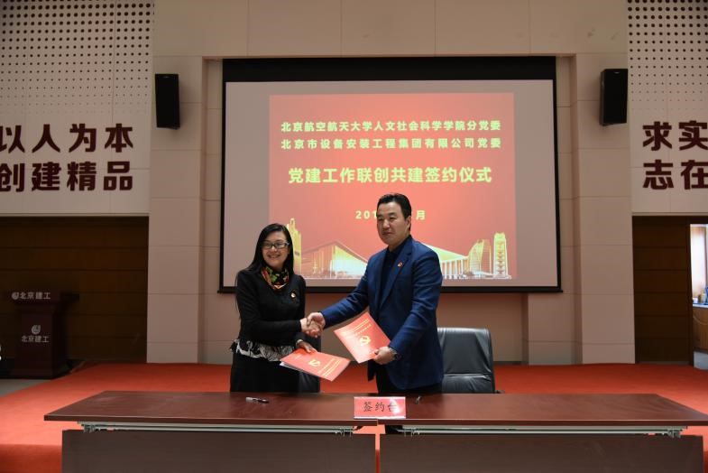 在观看北京建工集团及北京大兴国际机场宣传片后,校企党建联创共建签约仪式正式举行。李亚梅书记和王国辉书记分别代表williamhill英国官网william威廉中文官网分党委与北安集团党委签署共建协议。随后,北航人文公司行政管理与科技哲学党支部书记陈文博与北安时代电梯公司党总支书记张全乐,北航人文公司SY1811第一党支部书记严凰与北安集团公司机关第四党支部书记赵艳梅也分别代表各自党支部签署了共建协议。