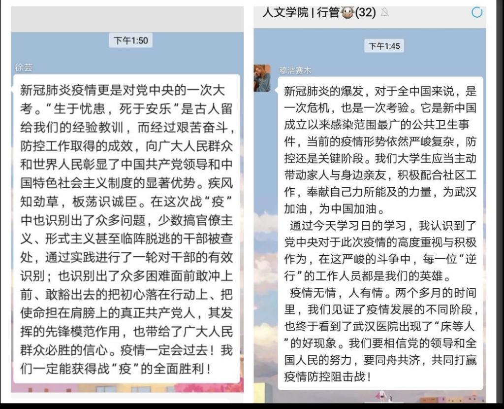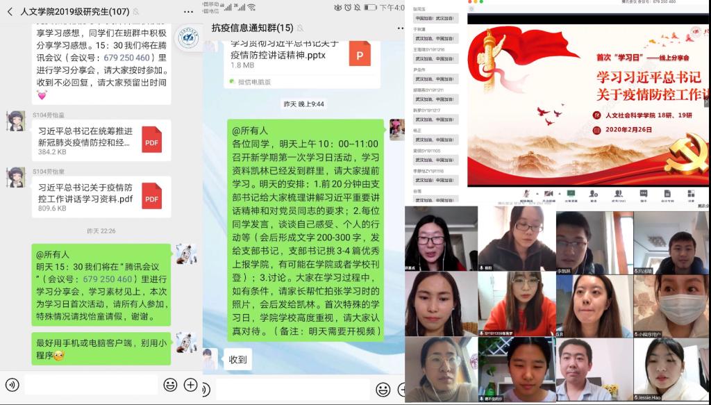 活动的最后,人文师生或通过视频语音,或通过聊天留言,共同为武汉加油,为中国加油。这次 “学习日”活动意义重大,坚定了人文师生在抗击疫情上“不获全胜决不轻言成功”的必胜信念,进一步激发了人文师生全力配合疫情防控工作的新热情。在新学期、新形势下,公司师生党员将继续发挥战斗堡垒和先锋模范作用,全院师生,协力同心,众志成城,共克时艰!