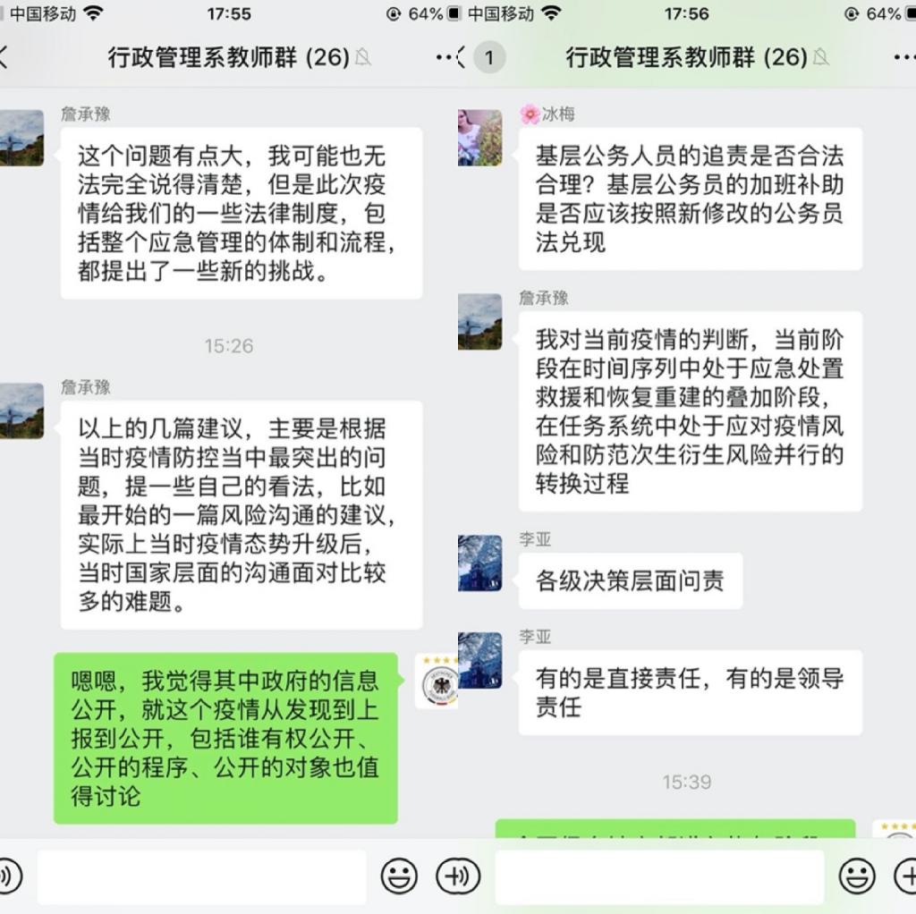 教师张路蓬学习后表示:“各位老师在群里就疫情与国家治理、网课等近期热点及工作问题进行了讨论,让我深刻感受到了各个城市对于此次疫情的高度重视及快速反应能力,也认识到了国家治理泥泞路上仍然有许多需要解决的短板问题,有待我们公共管理学者进一步研究。”