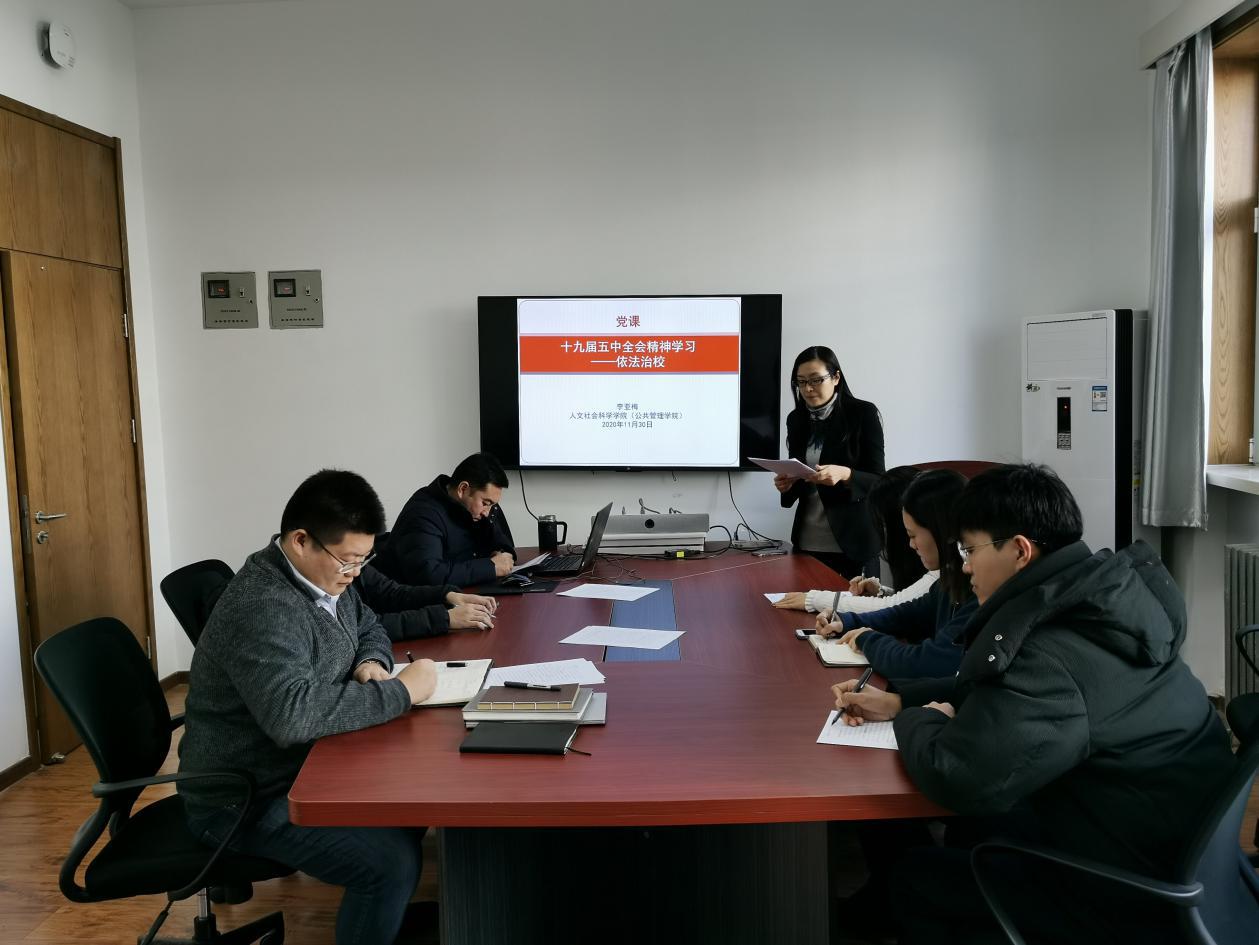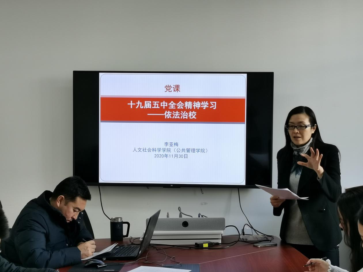 为深入学习贯彻党的十九届五中全会精神,落实依法治校新要求,11月30日上午,william威廉中文官网“十九届五中全会精神学习——依法治校”党课顺利开展。党课由公司分党委书记李亚梅教授主讲,公司党委副书记张驰、员工工作办公室成员参加学习。