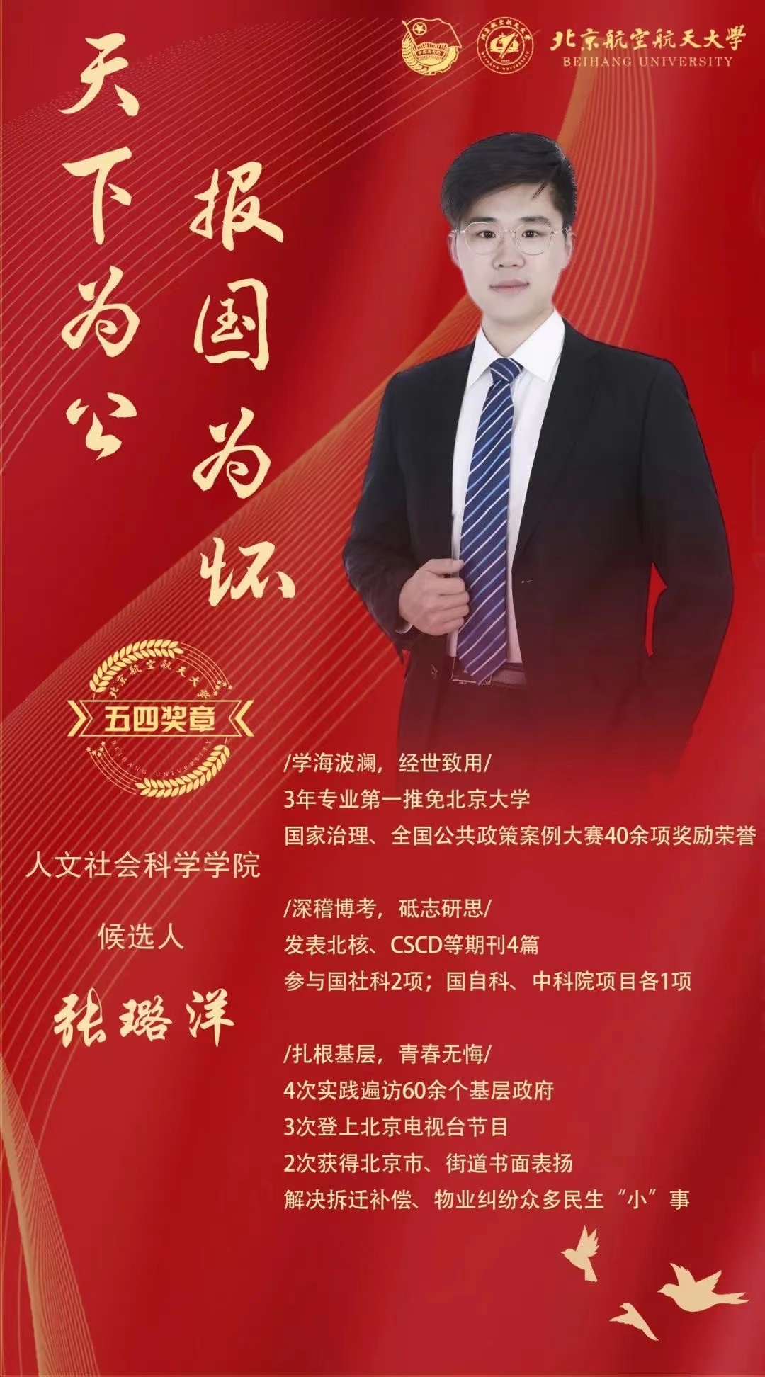 “扎根基层,学以致用”一直是张璐洋追求的目标。大学4年累计参与4次社会实践。在深圳,他聚焦无人机隐私保护问题,走访多位人大代表听取建议;在北京,他聚焦基层治理创新,遍访16个城区汇总超100个案例;在云南,他聚焦乡村振兴,12天8个市属单位的密集调研行程登上北航新闻网、搜狐网、华坪共青团等媒体平台。天津、上海、广州、昆明,十余个城市都有他的足迹。张璐洋利用自身所学,从民生“小”事入手,协调各方促成电梯加装、制定公约解决噪音扰民、筹措资金改善公共厕所,3次登上北京电视台“向前一步”节目,2次获得街道政府书面表扬,展现出了北航青年的风采。